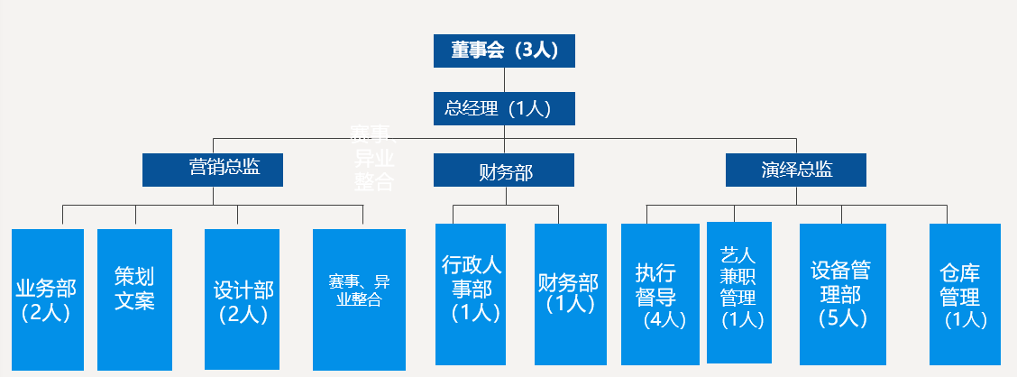 公司目前四大業(yè)務(wù)模塊:線(xiàn)下活動(dòng)執行、抖音藍V運營(yíng)、物料制作和印刷、生日派對,每個(gè)模塊獨立運營(yíng),公用財務(wù)和行政人員。